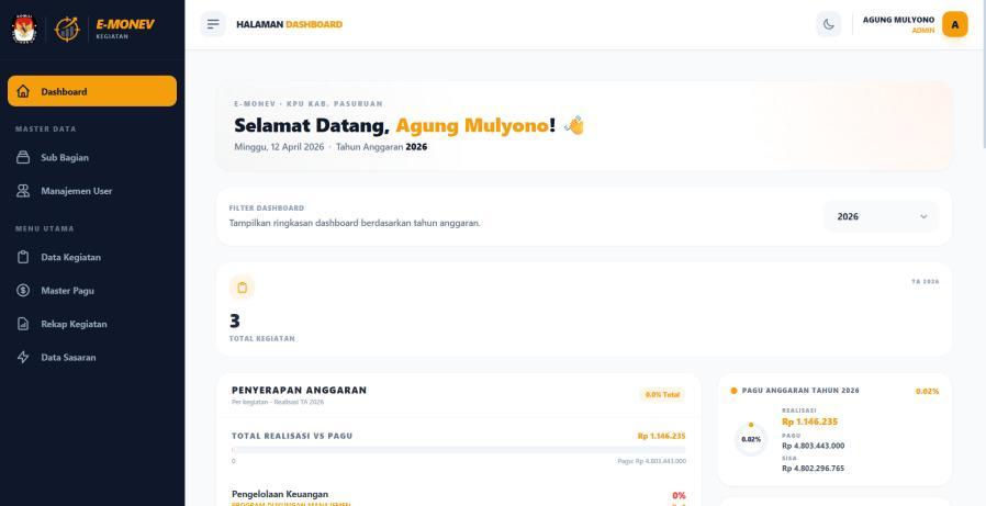 Setelah login, pengguna akan melihat antarmuka utama sistem E-MONEV yang terdiri dari sidebar navigasi di sisi kiri dan area konten di sisi kanan.