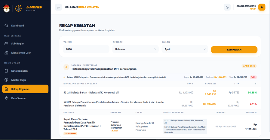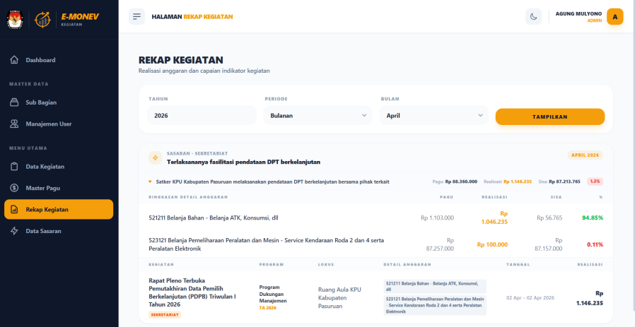 Halaman Rekap Kegiatan menampilkan realisasi anggaran kegiatan KPU Kabupaten Pasuruan secara menyeluruh. Dapat diakses melalui menu ‘Rekap Kegiatan’ pada sidebar MENU UTAMA.