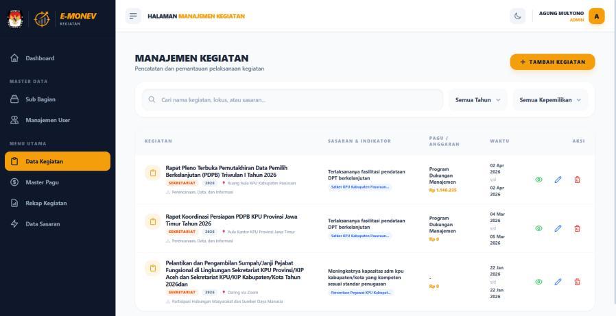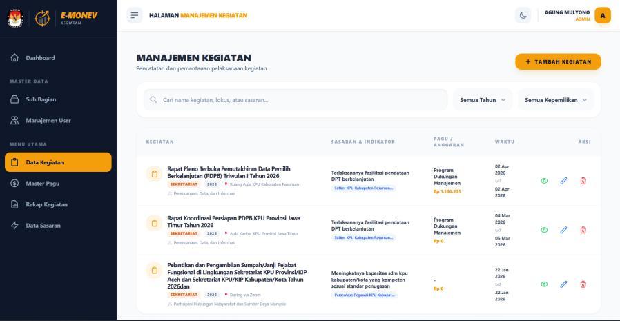 | MENU UTAMA | Data Kegiatan, Master Pagu, Rekap Kegiatan, Data Sasaran. |